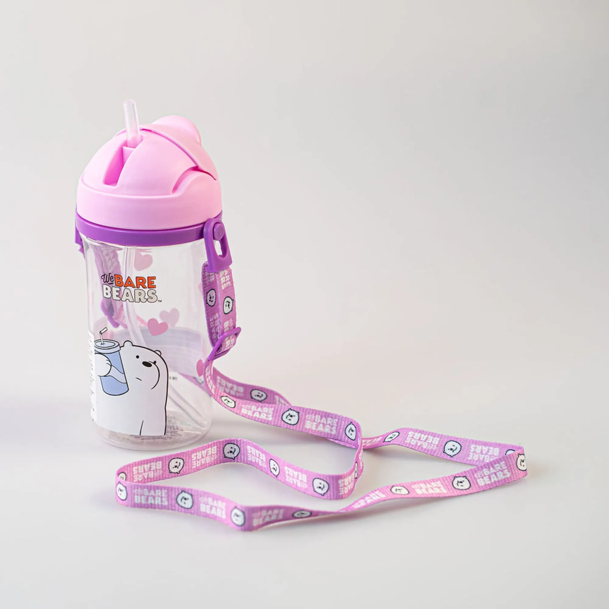 Borraccia We Bare Bears – Orso Bianco. Borraccia Trasparente E Rosa Con Tracolla Regolabile Lilla E Cannuccia A Comparsa Sul Tappo.