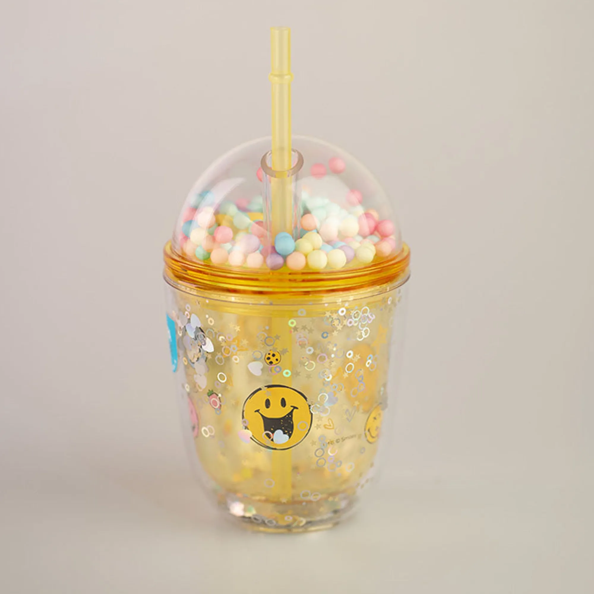 Bicchiere Giallo E Trasparente In Lastica Con Doppio Strato E Cannuccia.