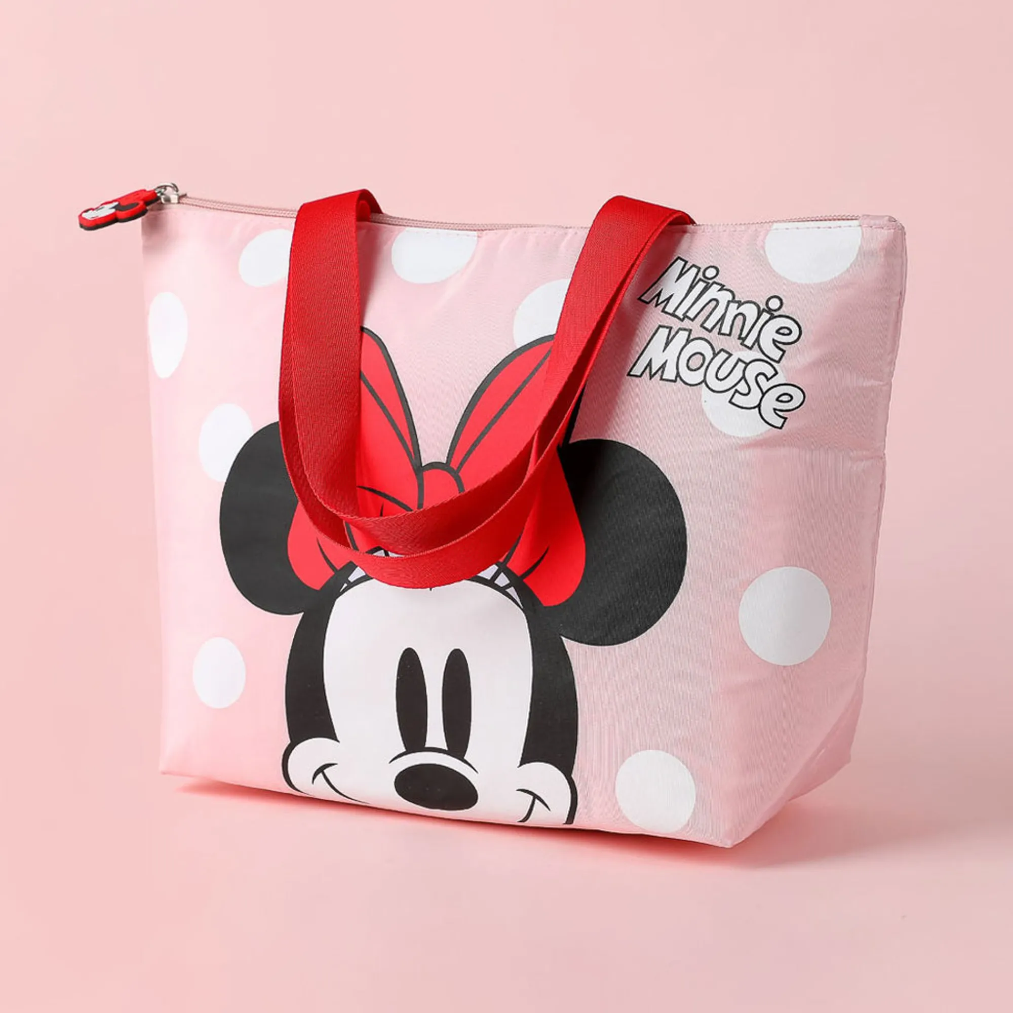 La Borsa È Di Colore Rosa Con Il Volto Di Minnie E Un Pratico Manico Rosso