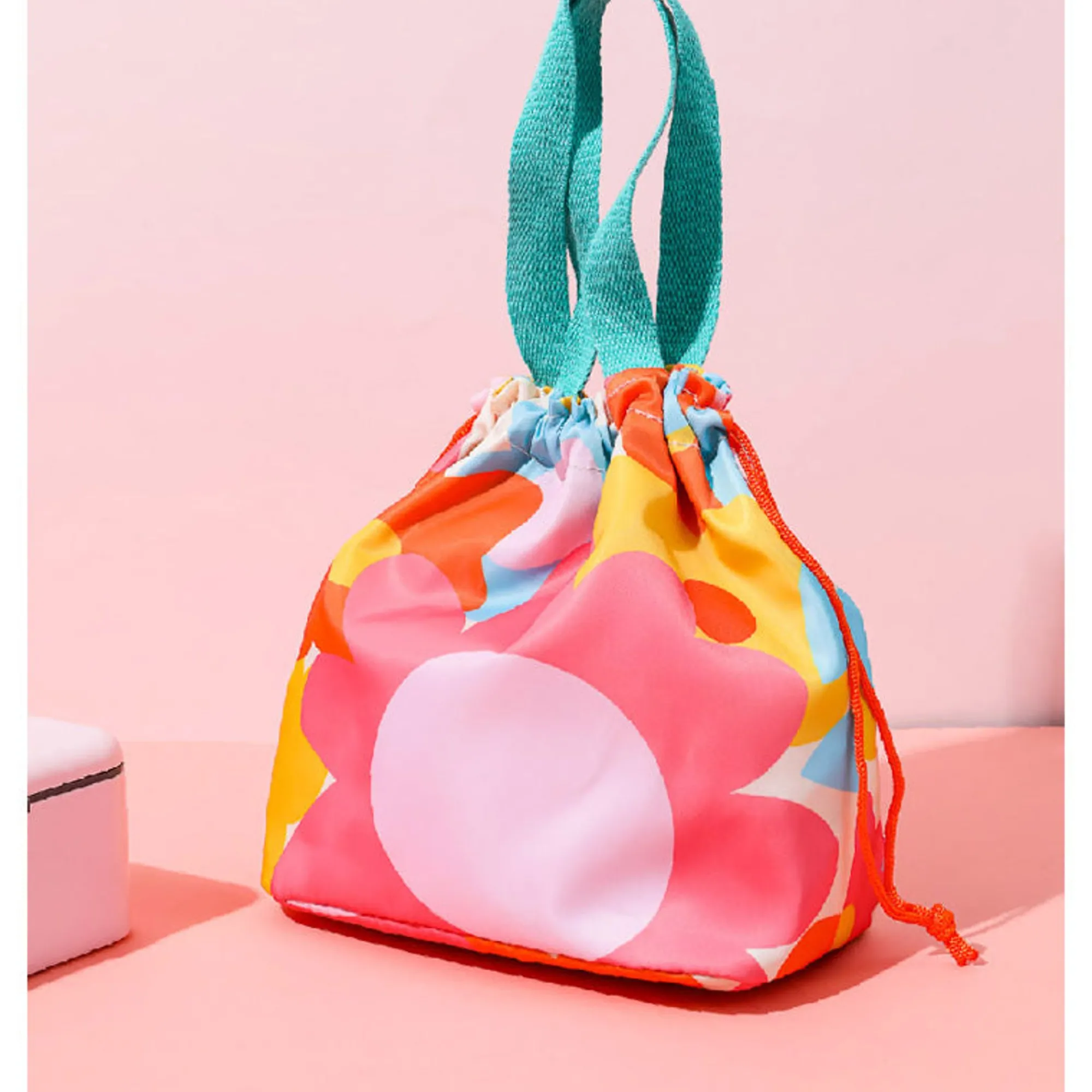 Borsa Porta Pranzo Con Fantasia A Fiori Rosa E Manico Verde Acqua.
