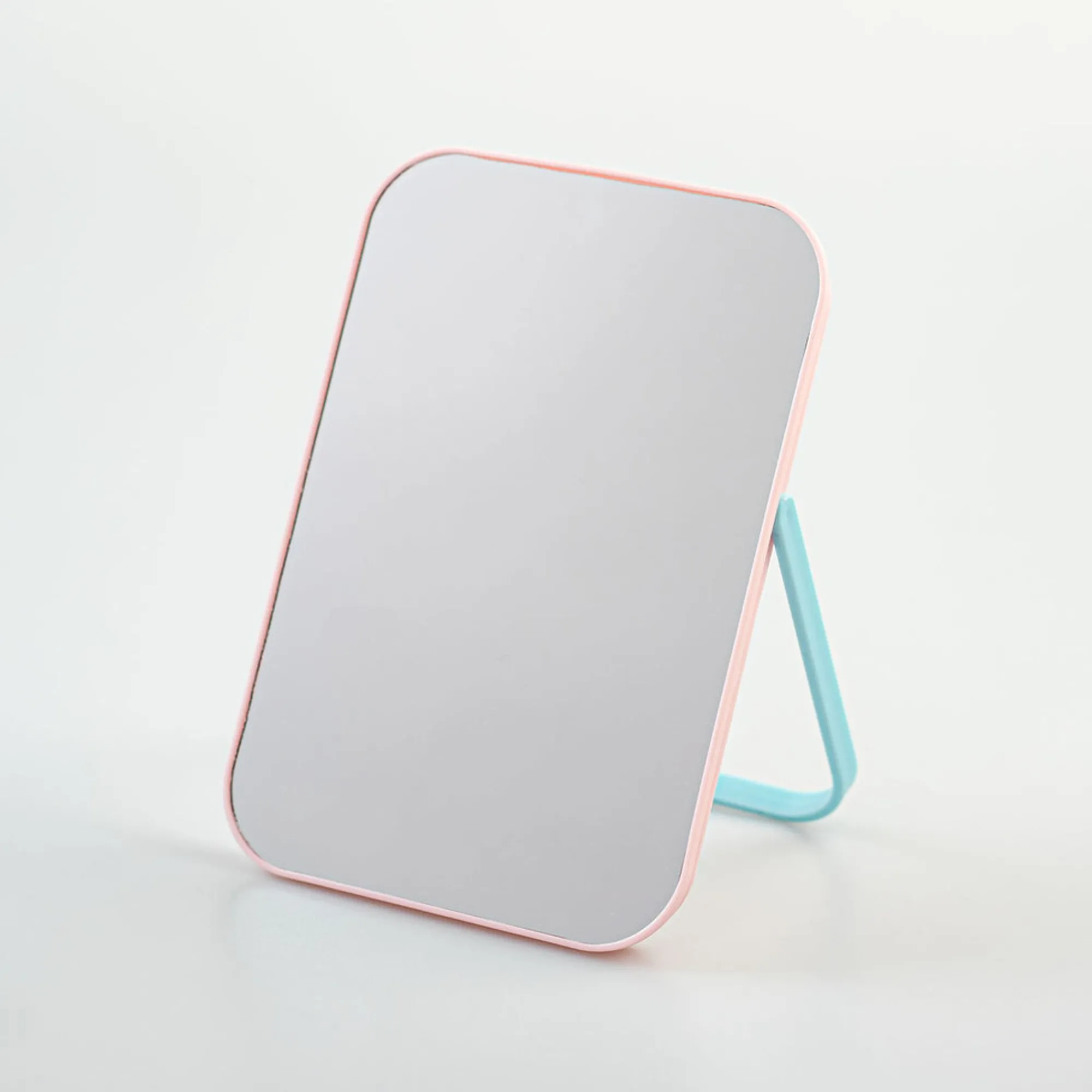 Specchio Da Tavolo Rettagolare, Con Taglio Minimal In Color Rosa Con Piedino Autoreggente Azzurro.