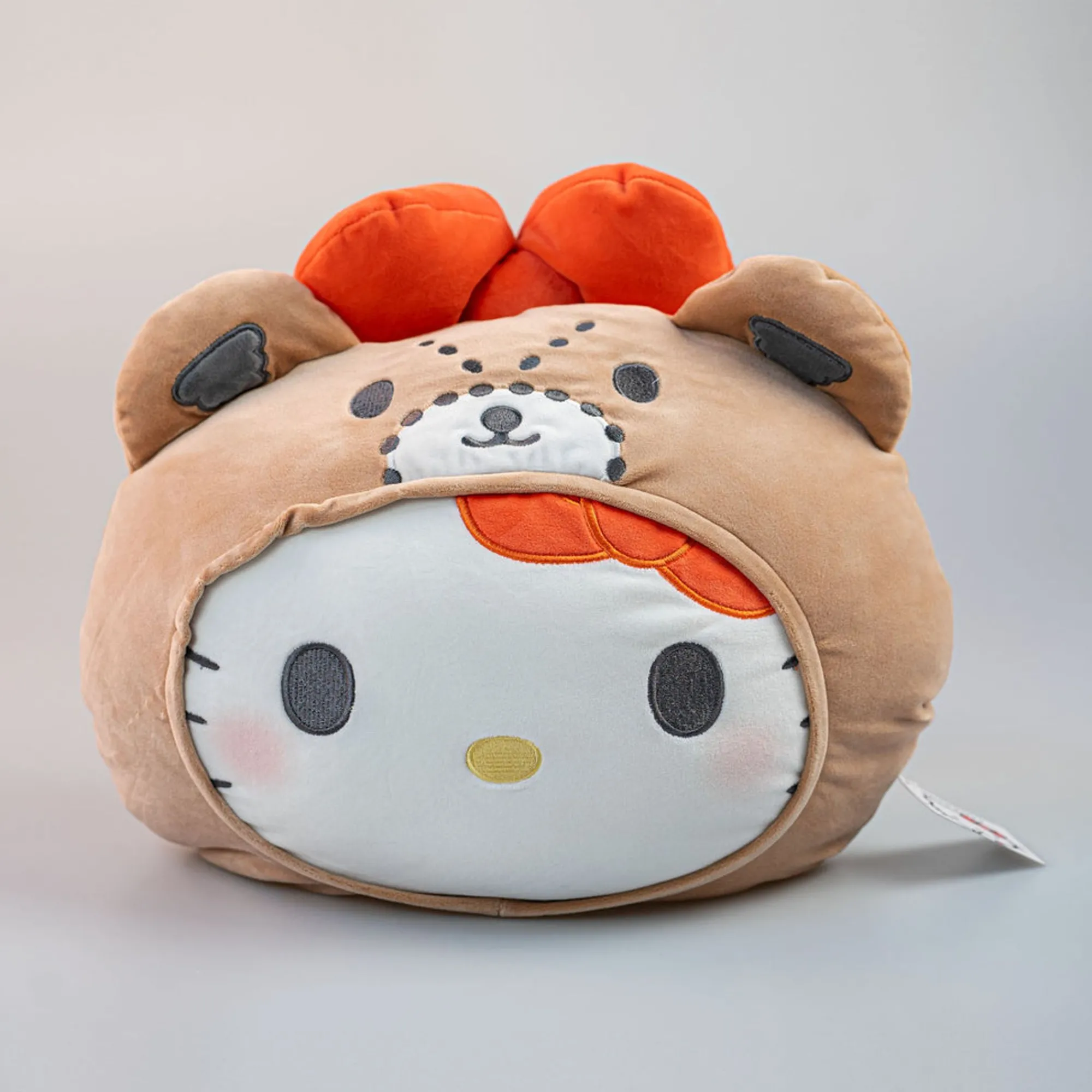 Cuscino Hello Kitty Della Collezione Sanrio Colore Bianco E Beige Con Fiocchetto Rosso.